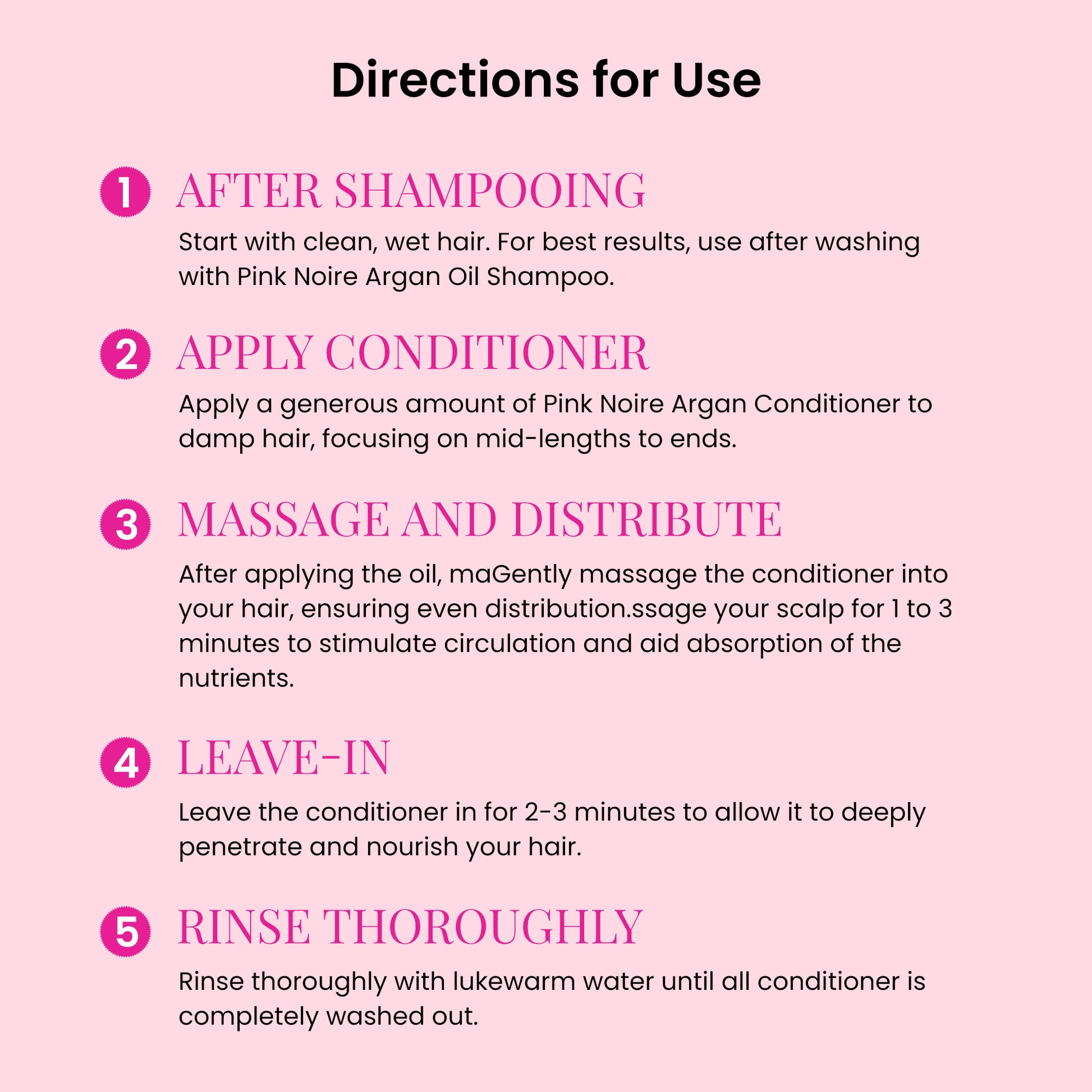 - Store in a cool, dry place away from direct sunlight. Experience the luxurious hydration and rejuvenation of Pink Noire Argan Conditioner, designed to transform your hair into a vibrant, lustrous mane.