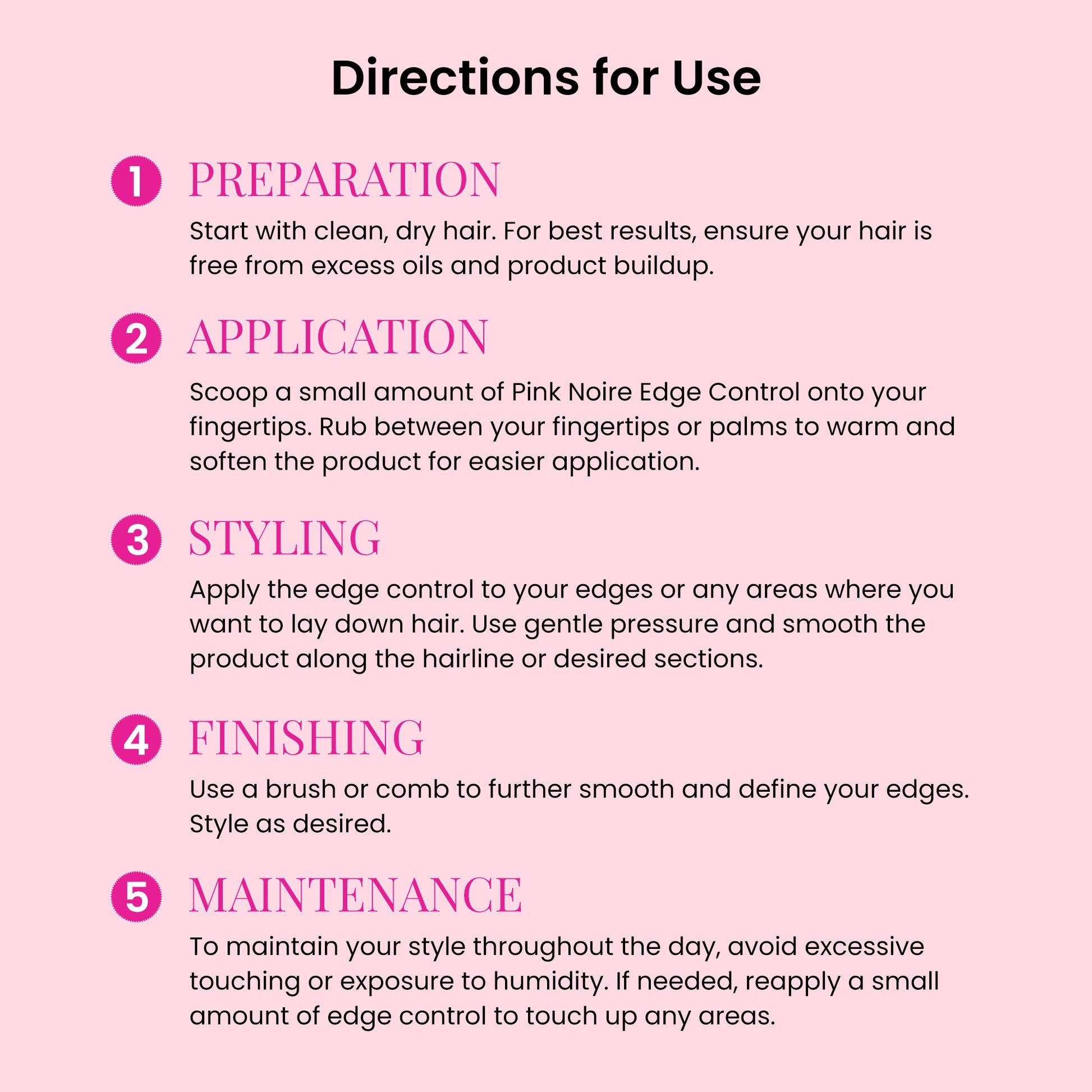 Product Description: Achieve sleek, polished edges with Pink Noire Edge Control. Formulated to provide a long-lasting hold without flaking or leaving a white residue, this edge control is ideal for creating smooth, defined edges and finishing styles with precision. Infused with nourishing ingredients, it offers a non-greasy, non-sticky formula that enhances shine and maintains hair health. Perfect for all hair types and textures, Pink Noire Edge Control keeps your hair looking effortlessly neat and styled throughout the day.